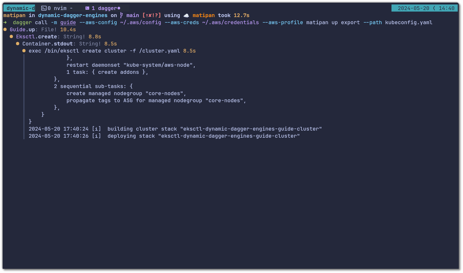 dagger call --mod github.com/matipan/dynamic-dagger-engines/guide --aws-creds ~/.aws/credentials --aws-profile "$AWS_PROFILE" up export --path kubeconfig.yaml