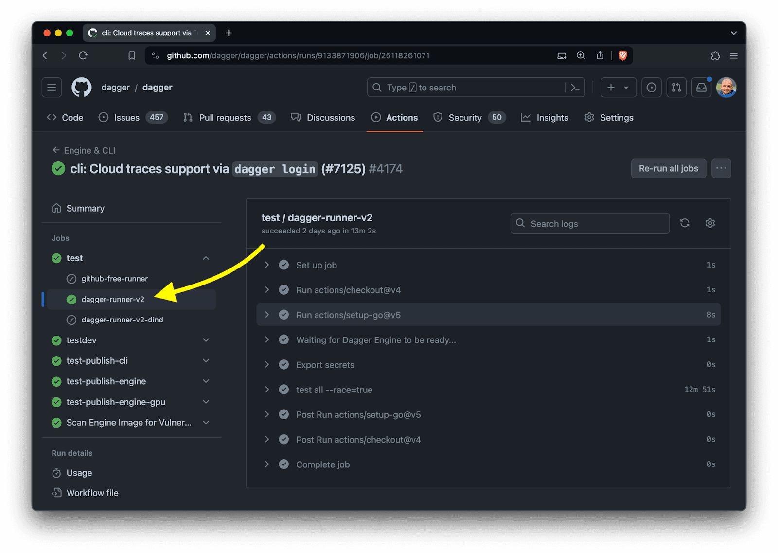 The setup that we shared above is what we are currently using for all our Dagger pipelines, including those coming from contributions to Dagger. Feel free to check out our public GitHub Actions Workflows. If you look at a job, you will notice dagger-runner-v2