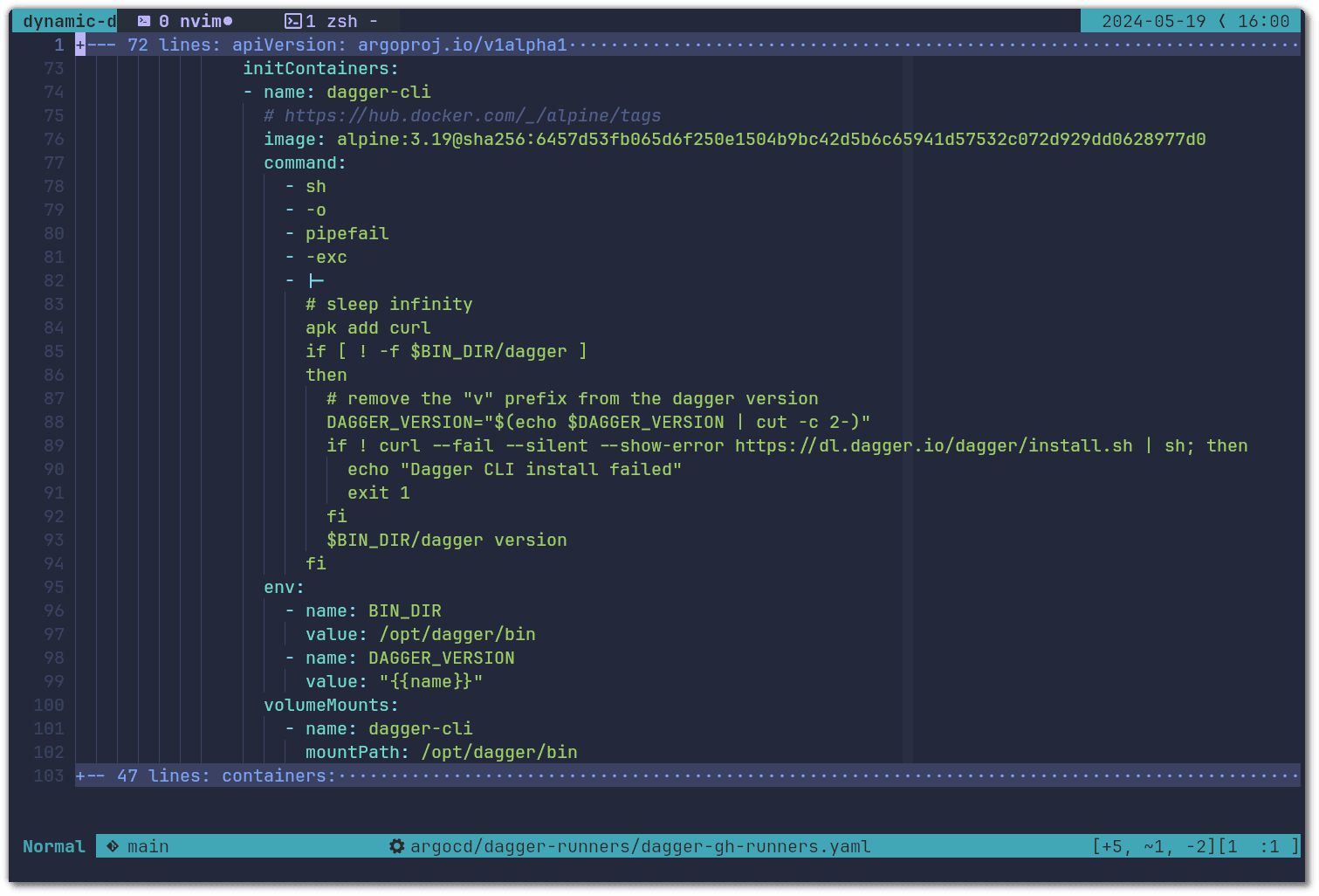 We then install the dependencies for our runners. The main one being the Dagger CLI. To install it, we use an init container that shares the volume of the Dagger CLI binary with the runner container. The templated variable {{name}} used below is made available by argocd-github-release-generator and holds the value of a specific Dagger version, e.g v0.11.4: