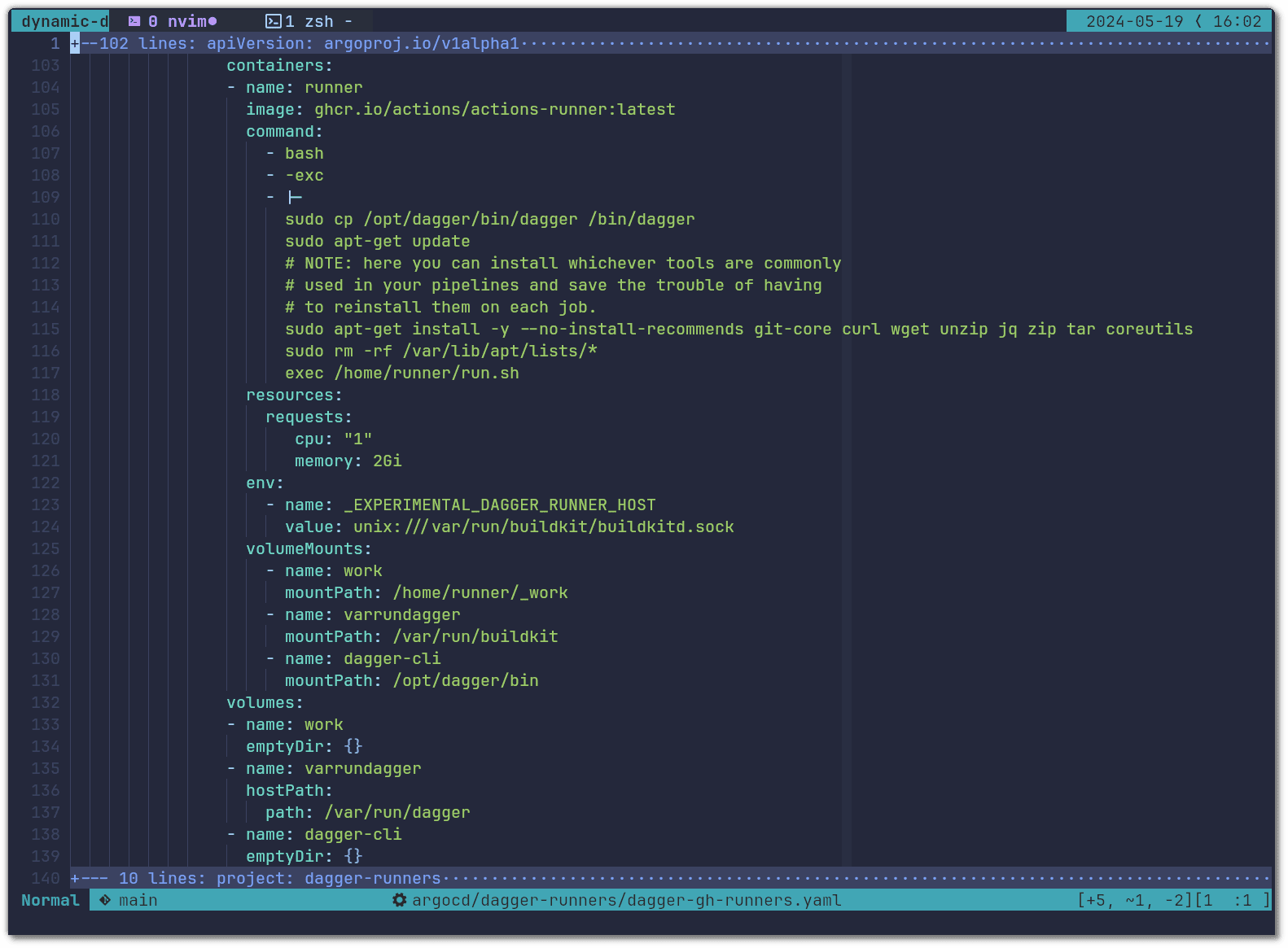 In the configuration above you will see that we specified the resources for the runner container (1 core and 2GB of RAM). However, as you will see below, we do not configure resource requirements or constraints on the Dagger Engine containers. This is intended and it is due to the requirements different jobs have and how they get assigned to Dagger Engines. Having many runner pods connect to a single Dagger Engine is a good way of reusing cached operations across different runs. In our case, some jobs that GitHub Actions Runners pick up are small and require little compute resources, but others may need at least 16CPUs, 32GB of RAM and an entire NVMe disk to themselves. Due to this difference, sizing the GitHub Actions Runners pods instead of the Dagger Engine will determine how many can run in parallel on the same Dagger Engine.