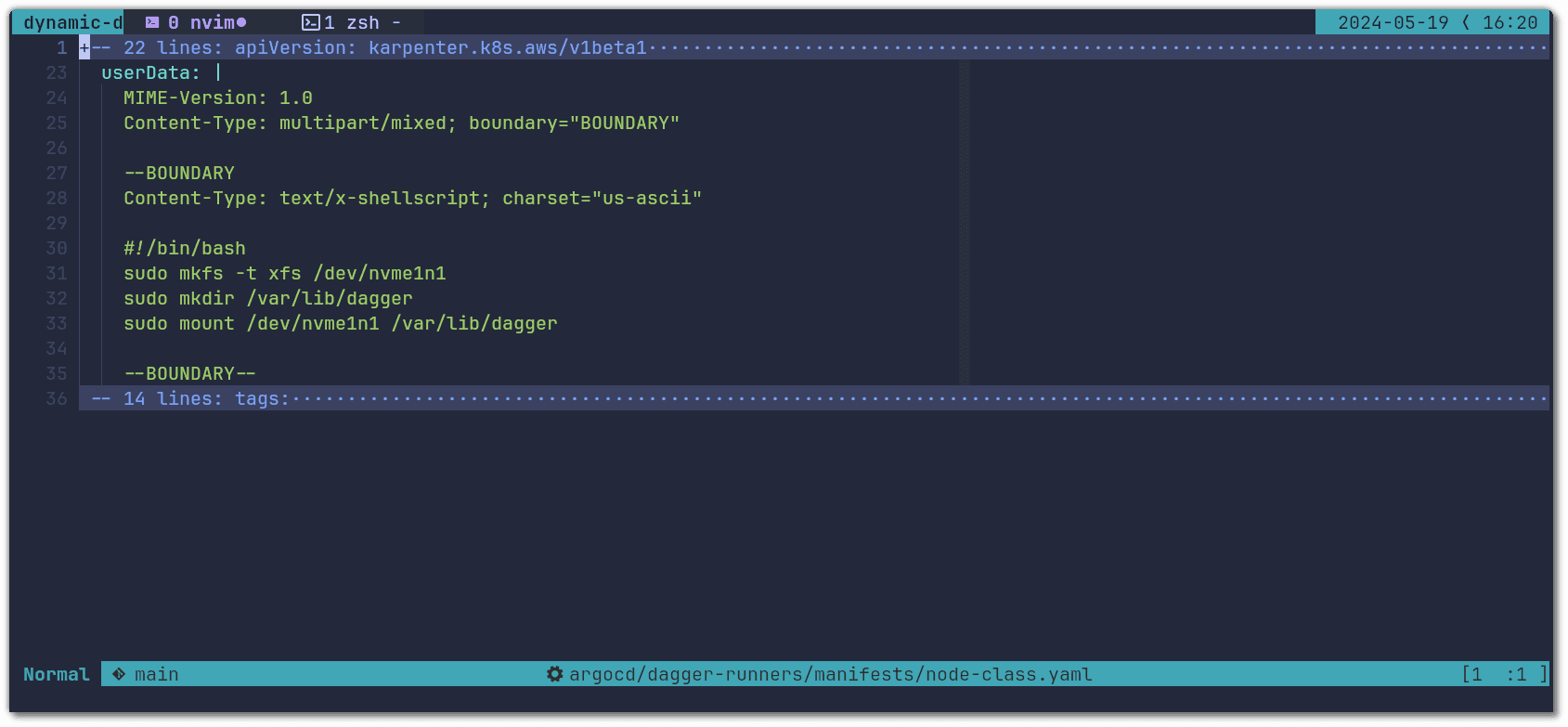 On top of this, you want to use the NVMe disk for Dagger’s state directory. Here is an example of how to configure these with Karpenter’s NodeClass and Amazon Linux 2 instances: