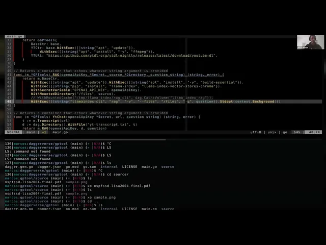 In a recent community call, Marcos Nils demonstrated how to use Dagger with LlamaIndex to build a RAG data pipeline for YouTube videos. His pipeline consists of two Dagger Functions: