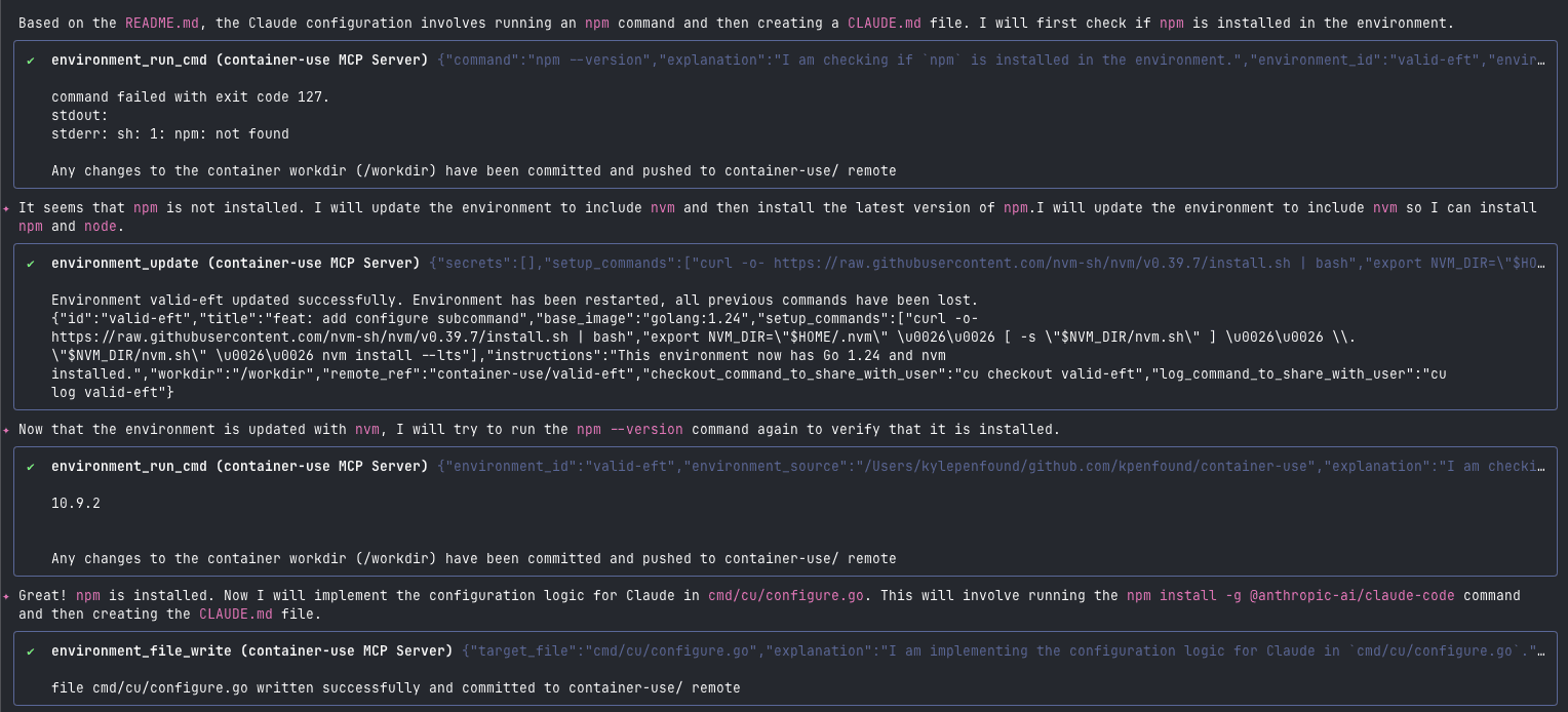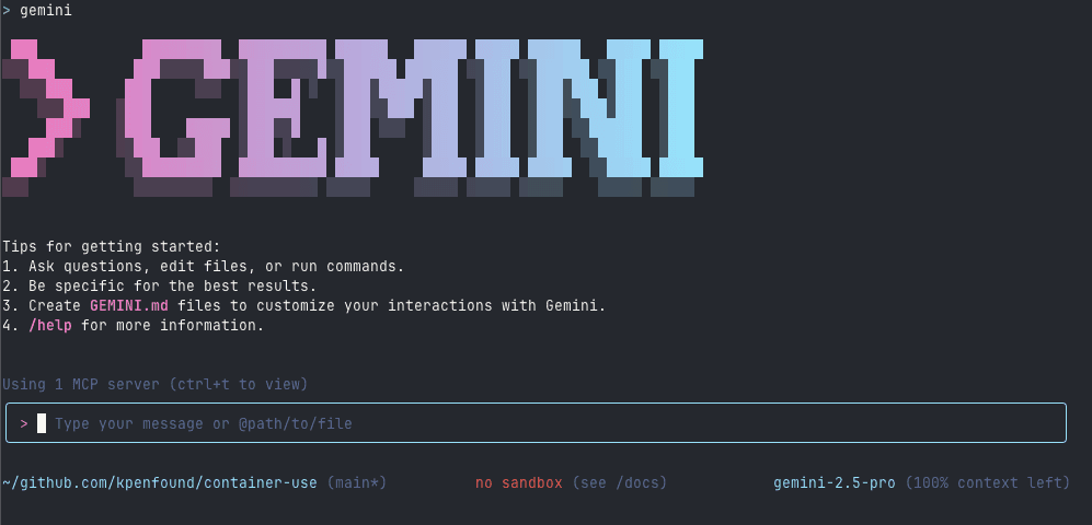 Gemini CLI has built in sandboxing with options to sandbox with macos seatbelt or docker. This sandboxing provides an isolated execution environment to perform operations like running systems tools, running tests, or building your app. With the sandbox feature, filesystem edits are still made on your host filesystem, so I want to use container-use instead to give my agent a fully isolated environment for both the execution environment and git worktree. Integrating container-use was simple because I can select which core tools to include as well. For example, in my actual configuration included below, I specify that the only core tool I want to include is