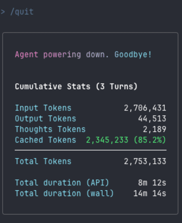 - When I’m done with a session, Gemini CLI outputs a helpful summary of my session. It includes information about the turns, token usage, and duration.