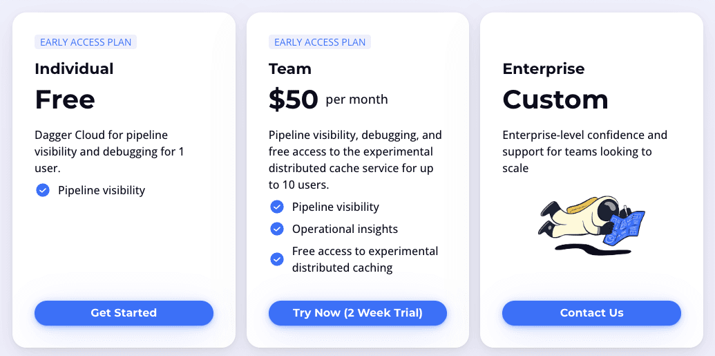 Since we released Dagger Cloud in early access last fall, many of you have told us about how you use it, what you like best, and what could be improved. We are grateful for this invaluable feedback, and today we are acting on it with two new pricing plans: a flat-rate plan for teams, and a free plan for individuals.