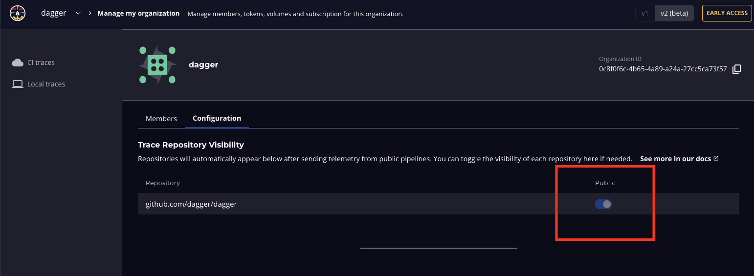 - Managing Visibility: To turn off public traces, go to your organization settings in Dagger Cloud and select the Configuration tab. Toggle the Trace Repository Visibility setting to enable or disable public access to traces. Once turned off, anyone attempting to access a trace without permissions will be redirected to the login page, ensuring that only authorized users can view it.