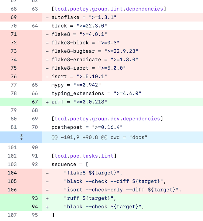 The Adopt Ruff PR demonstrates both a reduction in dependencies and numerous code improvements to satisfy the linter. Below, I’ll expand a bit more on what I found were the main benefits.